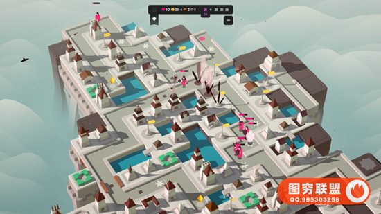 塔楼会攻击入侵者;道路搭建出了敌人行走的路径;旗帜能延展岛屿,让你有更