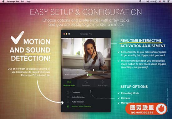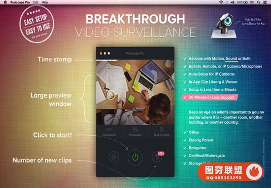 Periscope Pro 可以让你的Mac成为录制有声音视频的监控工具。你可以存储视频来看其后来,或自动的上传其为你可遥远地看发生了什么!