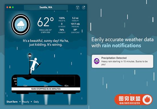 如果雨神对你生气,那么CARROT会向你展示一个短期预测,告诉你它何时会开始出现。 (仅适用于美国,英国,爱尔兰和加拿大部分地区。其他所有产品均适用于全球。)