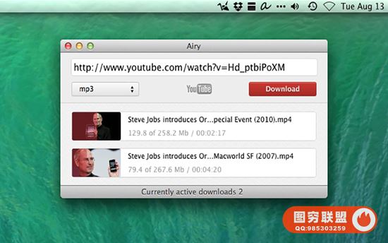 Airy 是一款在 OS X 下的 Youtube 视频下载工具,简单易用,Airy for mac选择视频下载的时候还能选择视频的清晰度,输入要下载的 Youtube 网址,选择可用的分辨率,然后就开始下载了。