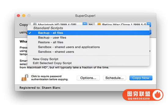 工业克隆! SuperDuper有足够的功能,以满足高级用户了。它简单但强大的脚本拷贝功能可以的究竟是什么文件被复制,被忽略的完全控制,甚至别名(“软挂钩”,为的Unix倾倒)从一个驱动器到另一个。