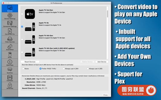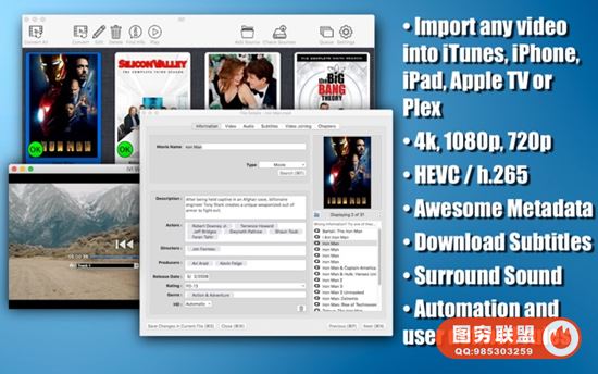 iVI将自动识别电视节目和电影,并添加海报图稿,电影情节或剧集详细信息,演员表等。 iVI将自动为所有Apple平台(包括Mac,AppleTV,iPad,iPhone和iPod)格式化视频。 iVI还支持高清视频(包括4k,1080p和720p),环绕声,多个音轨(用于各种语言)和字幕。