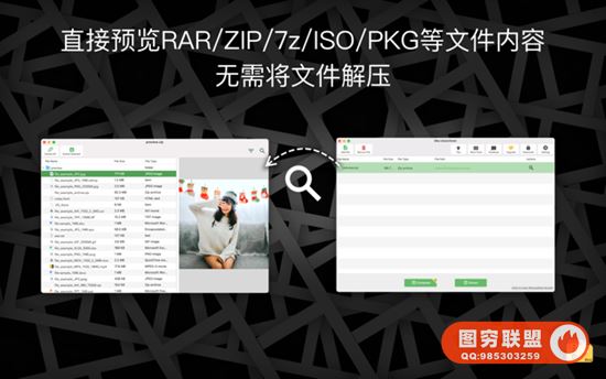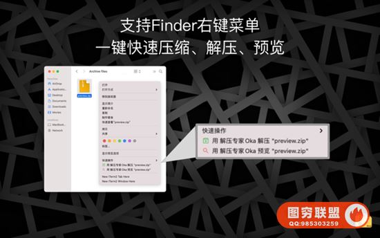 最新支持Finder扩展,直接在访达中右键点击文件,即可通过菜单进行压缩/解压缩或预览文件操作,大大简化了的操作步骤。