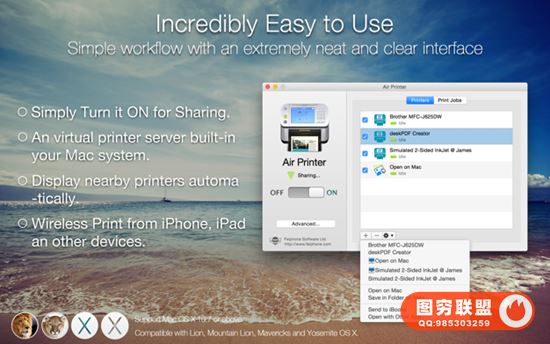 Air Printer 可以将您的 Mac 变成一台虚拟打印机,在您的 Macbook、iMac 上运行 Air Printer 以将其打印机共享到您附近的 Mac 或其他设备,然后无论您是在房间的另一边还是房子的另一边,您可以在需要时打印所需内容。Air Printer 可将文档、照片、网页、电子邮件等从您的计算机无线打印到您的所有打印机。