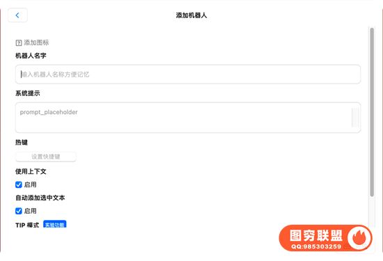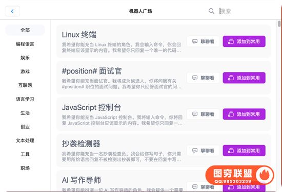 内置了丰富机器人和对话模板,覆盖各种日常场景,基本开箱即用。