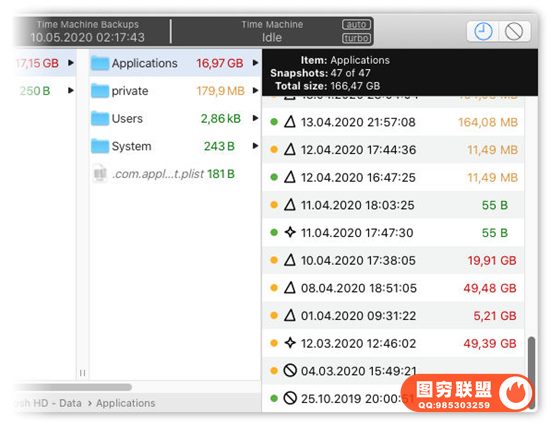 BackupLoupe会立即显示哪些文件占用了最多的空间。扫描的快照会以不同的颜色进行编码,以便您可以区分大小。选择一个快照,浏览器视图将按照大小降序列出所有已备份的项目。