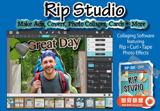 Rip Studio让您可以控制应用程序内部创建的每个元素。通过在图像周围绘制撕裂,撕裂或切割边缘。通过简单地调整滑块来卷曲边缘并使表面起皱。在现场背后,一个强大的3D光引擎可以使表面的皱纹和折痕看起来逼真;这个可调节的光源将有阴影从页面弹出。用磁带效果完成创意作品,或者从一个物品库中选择,如stickpins,钉书钉,生锈的指甲和宝石。你制作的每一个rip或你放置的磁带都是独一无二的,独一无二的!